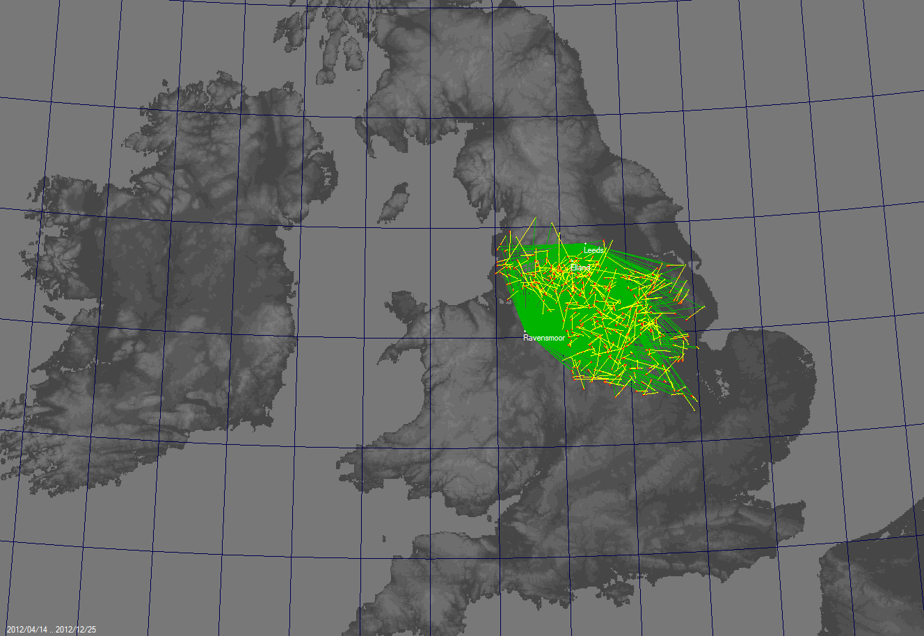 NEMETODE Meteor Data Set for 2012 This page contains the combined .csv file encompassing all meteor observations recorded by the cameras of the NEMETODE network during the period 01st April 2012 to 31st December 2012 (I87 commences 01st February 2012). Although the first node of the NEMETODE network (Ravensmoor) went live in October 2010 (see Overview & History) it was not until April 2012 that the second node (Leeds) came online, hence the choice of start date for this dataset. During this period there were 4223 individual meteor detections with 317 "Q1 Level" common events from four stations and five cameras: