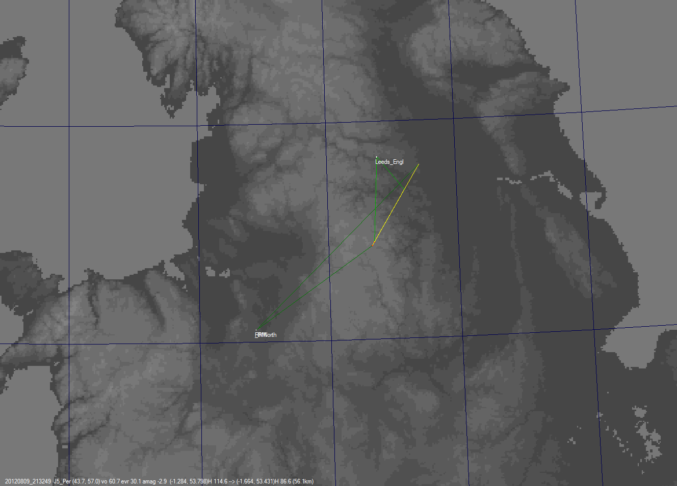 Bright Meteor of 09th August 2012 at 21:32:49 GMT / 22:32:49 BST The view from Ravensmoor of this magnitude -2.9 Perseid has the meteor passing up through Cassiopeia while that from Leeds also includes an aeroplane and a flock of birds. Visual reports of this event are available on the Armagh Fireball Report Page.