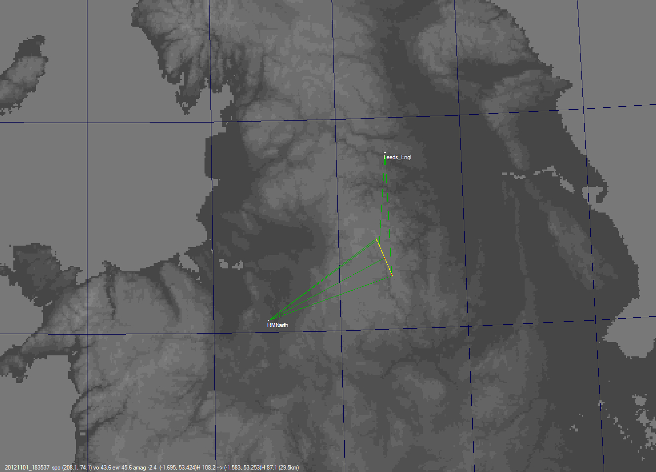 Bright Meteor of 01st November 2012 at 18:35:37 GMT The view from Ravensmoor of this magnitude -2.4 Sporadic also includes a slow moving satellite just to the left of the centre of the image. This was subsequently identified as Cosmos 1275 DEB #13017, debris from an on orbit collision.