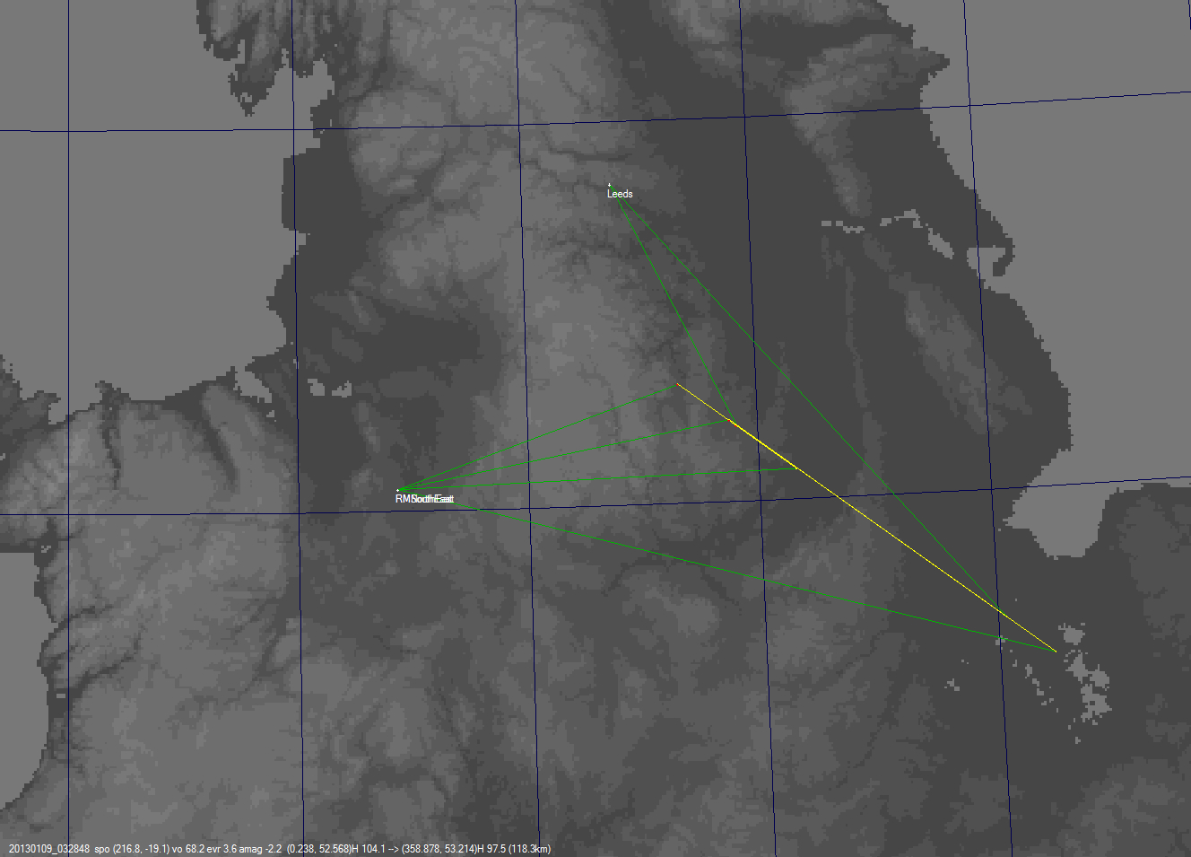 Bright Meteor of 09th January 2013 at 03:28:48 GMT A magnitude -2.2 Sporadic. The top image shows the view from Leeds while the next two images show the view from Ravensmoor. The two East facing cameras in Ravensmoor have been rotated clockwise through 90 degrees within their housings in order to minimise local overlap (see Nodes) and so what appears to be the bottom of the field of view is actually the left hand side.