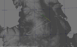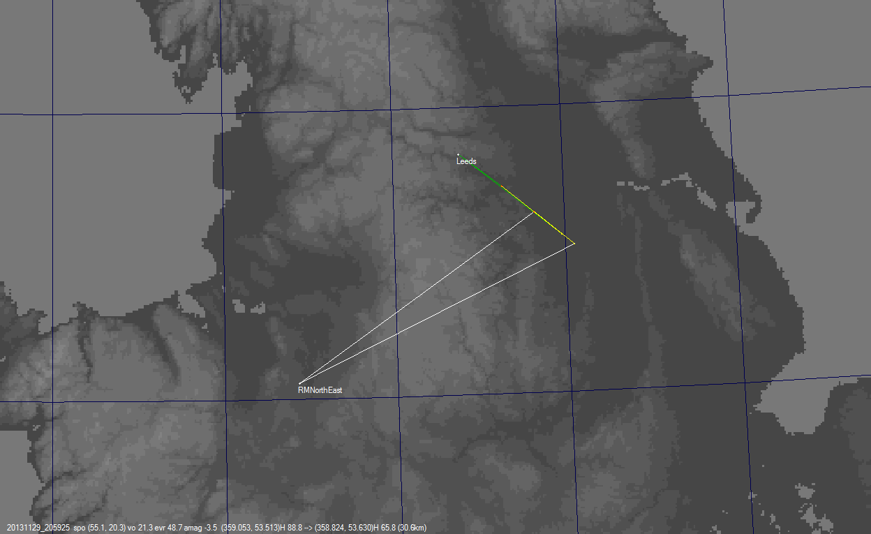 Bright Meteor of 29th November 2013 at 21:00:04 GMT On 29th November 2013 Paul Brierley reported on the BAA Forum and on the SPA Forum that a green fireball had occurred over Macclesfield at approximately 21:01 UTC. This was captured by NEMETODE Cameras and from the resultant data we've been able to derive a ground track and orbit. We can confirm that although it was a bright sporadic meteor, it wasn't quite bright enough to be classed as a fireball as the maximum magnitude was -3.5. The top left image is from Leeds whereas the top right is from Ravensmoor. The dashed line is due to the beacons from a passing aircraft that initially triggered the capture. The video has been edited down to cover the period when the fireball passed. Note that the Ravensmoor camera has been rotated clockwise through 90 degrees within its housings in order to minimise local overlap (see Nodes) and so what appears to be the bottom of the field of view is actually the left hand side. The derived ground track and orbit is shown on the bottom row.