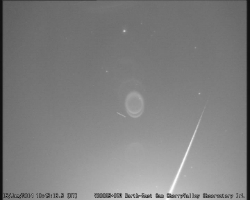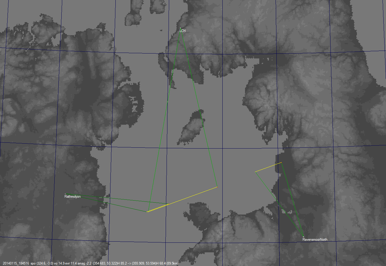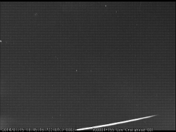 At 18:45:16 GMT on 15th January 2014 a very bright, slow moving meteor was detected on at least three NEMETODE cameras. Initial trajectory analysis suggests it became visible to the west of Anglesey, before heading on a east-north-east trajectory across the Irish Sea towards Blackpool. The maximum magnitude derived from NEMETODE data is -2.2 although part of the trail was outside the field of view of our cameras and hence it may have been bright enough to be classed as a fireball. Visual observers are strongly encouraged to submit their reports to the Armagh Fireball Report Page. Note that the Ravensmoor camera has been rotated clockwise through 90 degrees within its housings in order to minimise local overlap (see Nodes) and so what appears to be the bottom of the field of view is actually the left hand side. It now seems probable that this bright meteor was responsible for triggering the emergency response reported here and here. The sonic boom from the meteor could have been the loud noise reported by locals around 19:00 GMT as it would have taken approximately 10 minutes to reach South Wales. The bright meteor has been reported to the Coastguard at Milford Haven and they concur that it (currently) is the most likely explanation. ... individuals who believe they may have heard the sonic boom are requested to submit their report to the Armagh Fireball Report Page ... of particular interest will be their location and the precise time at which they heard the sound. This event features in the article "From Deckchairs to Desktops" in the May 2013 issue of Astronomy Now.